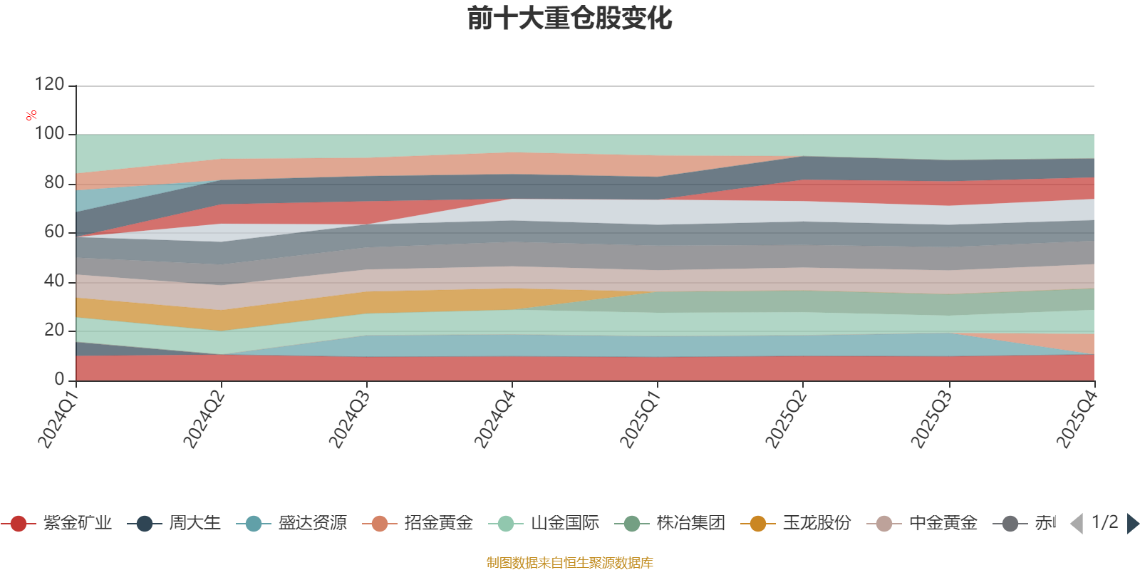 该基金持股集中度较高,近2年前十大重仓股集中度长期超过60%。截至2025年四季度末,基金十大重仓股分别是紫金矿业、中金黄金、山金国际、赤峰黄金、兴业银锡、株冶集团、西部黄金、湖南黄金、招金黄金、山东黄金。