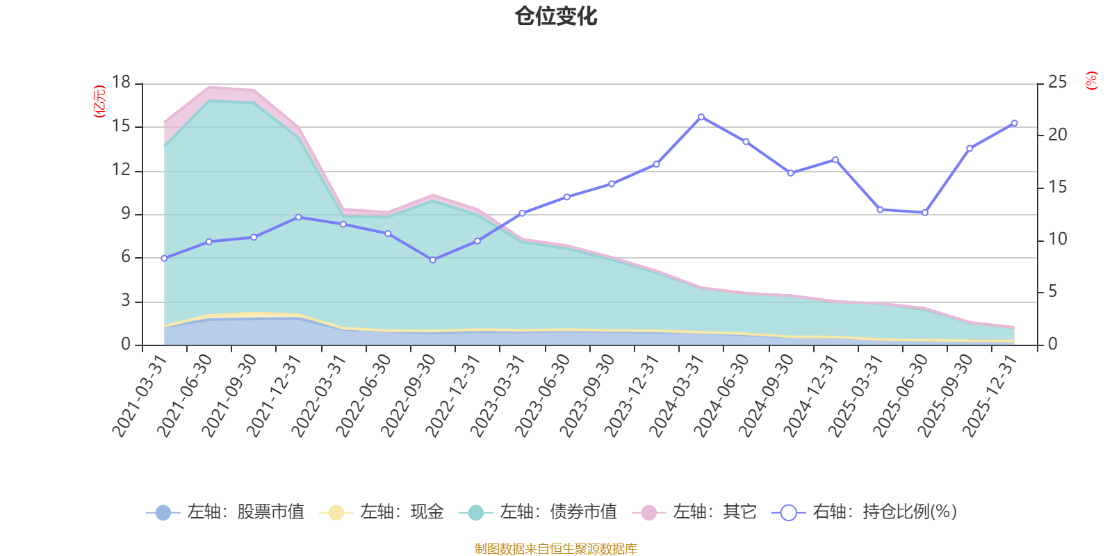 据定期报告数据统计,近三年平均股票仓位为16.7%,同类平均为19.2%。2024年一季度末基金达到21.8%的最高仓位,2022年三季度末最低,为8.14%。