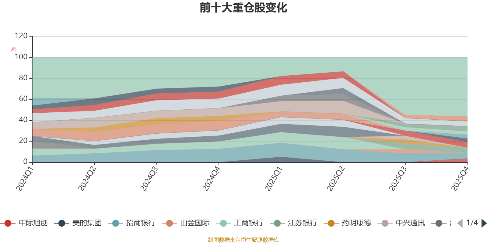 截至2025年四季度末,基金十大重仓股分别是招商银行、宁波银行、江苏银行、贵州茅台、杭州银行、立讯精密、新易盛、中际旭创、紫金矿业、东方电缆。