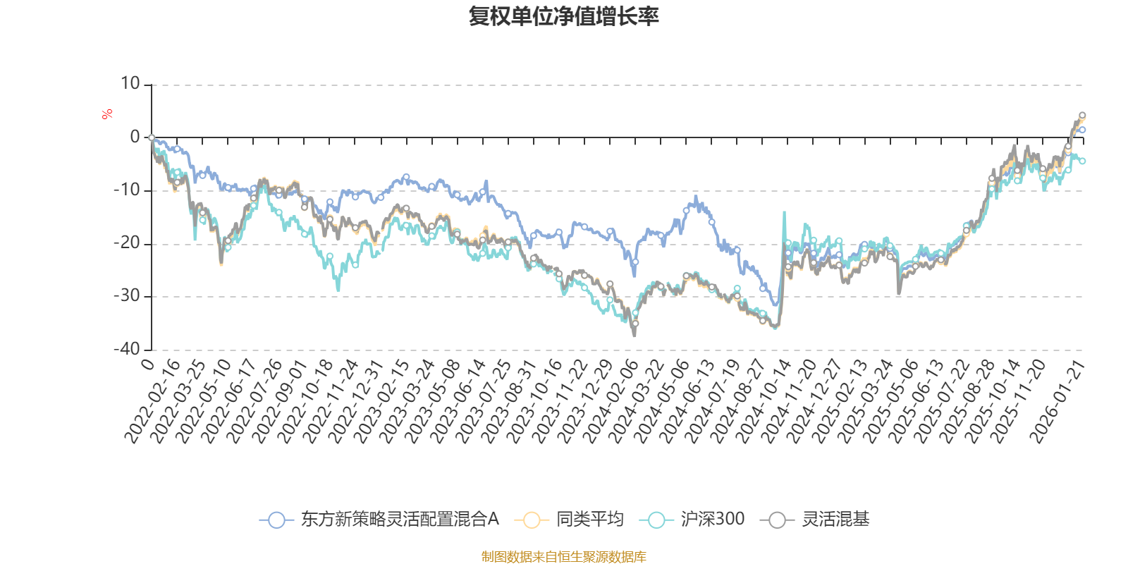 截至1月21日,东方新策略灵活配置混合A近三个月复权单位净值增长率为7.45%,位于同类可比基金672/1286;近半年复权单位净值增长率为22.58%,位于同类可比基金618/1286;近一年复权单位净值增长率为29.83%,位于同类可比基金676/1286;近三年复权单位净值增长率为10.72%,位于同类可比基金775/1286。