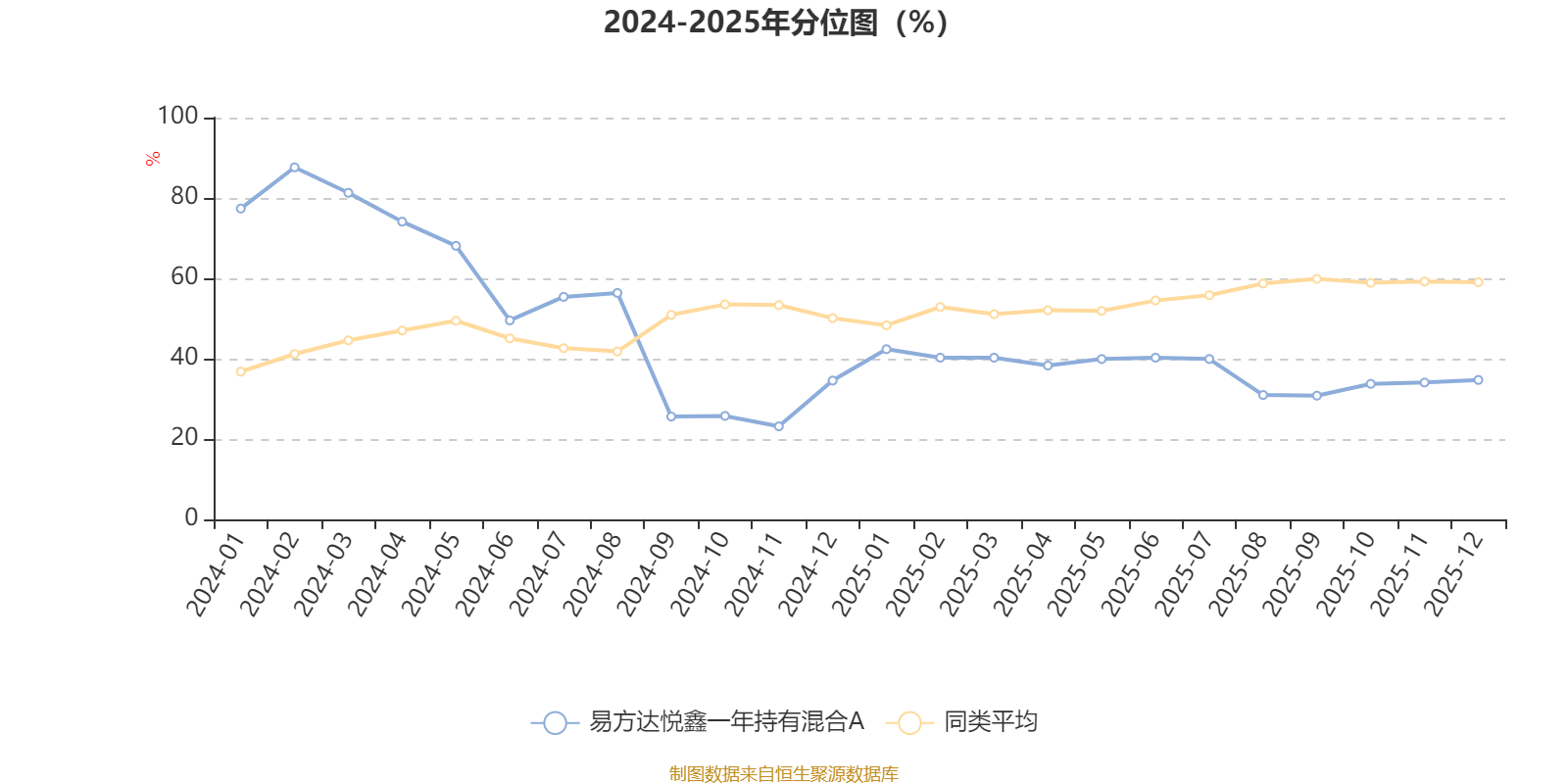 通过所选区间该基金净值增长率分位图,可以观察该基金与同类基金业绩比较情况。图为坐标原点到区间内某时点的净值增长率在同类基金中的分位数。