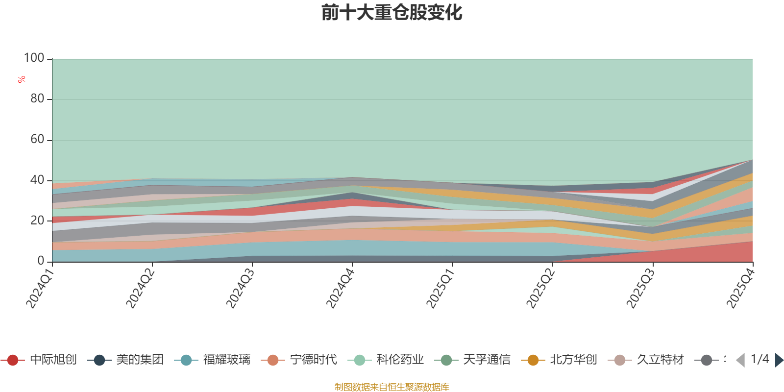 截至2025年四季度末,基金十大重仓股分别是中际旭创、新易盛、源杰科技、北方华创、宁德时代、科达利、兆易创新、天孚通信、紫金矿业、立讯精密。