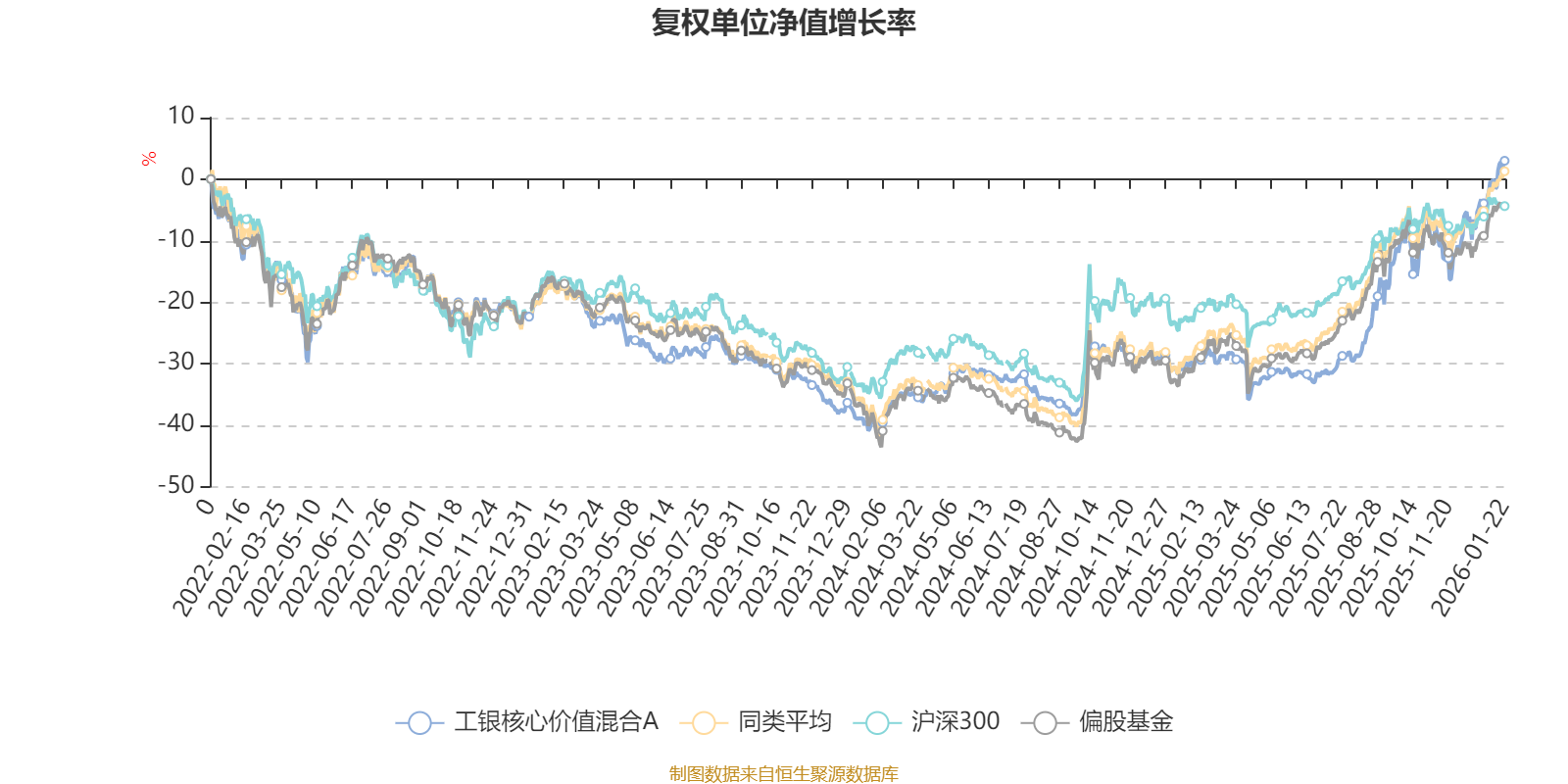 截至1月22日,工银核心价值混合A近三个月复权单位净值增长率为15.64%,位于同类可比基金14/130;近半年复权单位净值增长率为44.52%,位于同类可比基金18/130;近一年复权单位净值增长率为47.91%,位于同类可比基金44/130;近三年复权单位净值增长率为24.13%,位于同类可比基金57/125。