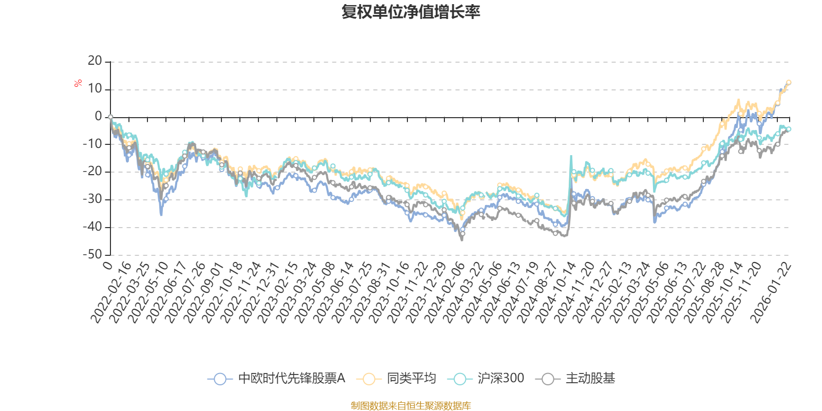 截至1月22日,中欧时代先锋股票A近三个月复权单位净值增长率为16.02%,位于同类可比基金7/58;近半年复权单位净值增长率为48.70%,位于同类可比基金7/58;近一年复权单位净值增长率为64.49%,位于同类可比基金8/57;近三年复权单位净值增长率为43.53%,位于同类可比基金20/57。