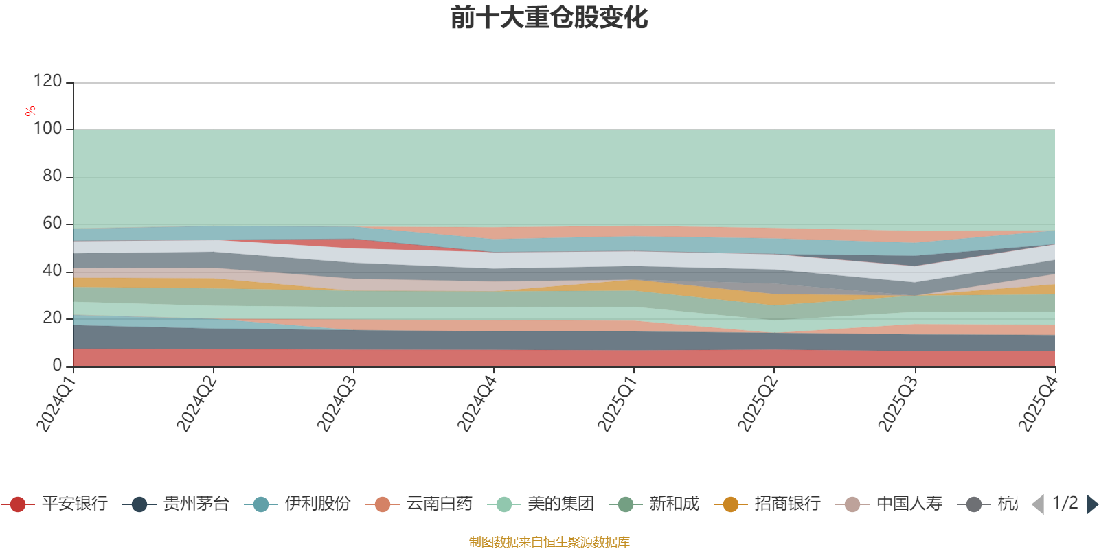 该基金持股集中度较高,且持股标的较为稳定。截至2025年四季度末,基金十大重仓股分别是新和成、贵州茅台、平安银行、中信证券、宁波银行、兴业银行、美的集团、中国人寿、云南白药、招商银行。