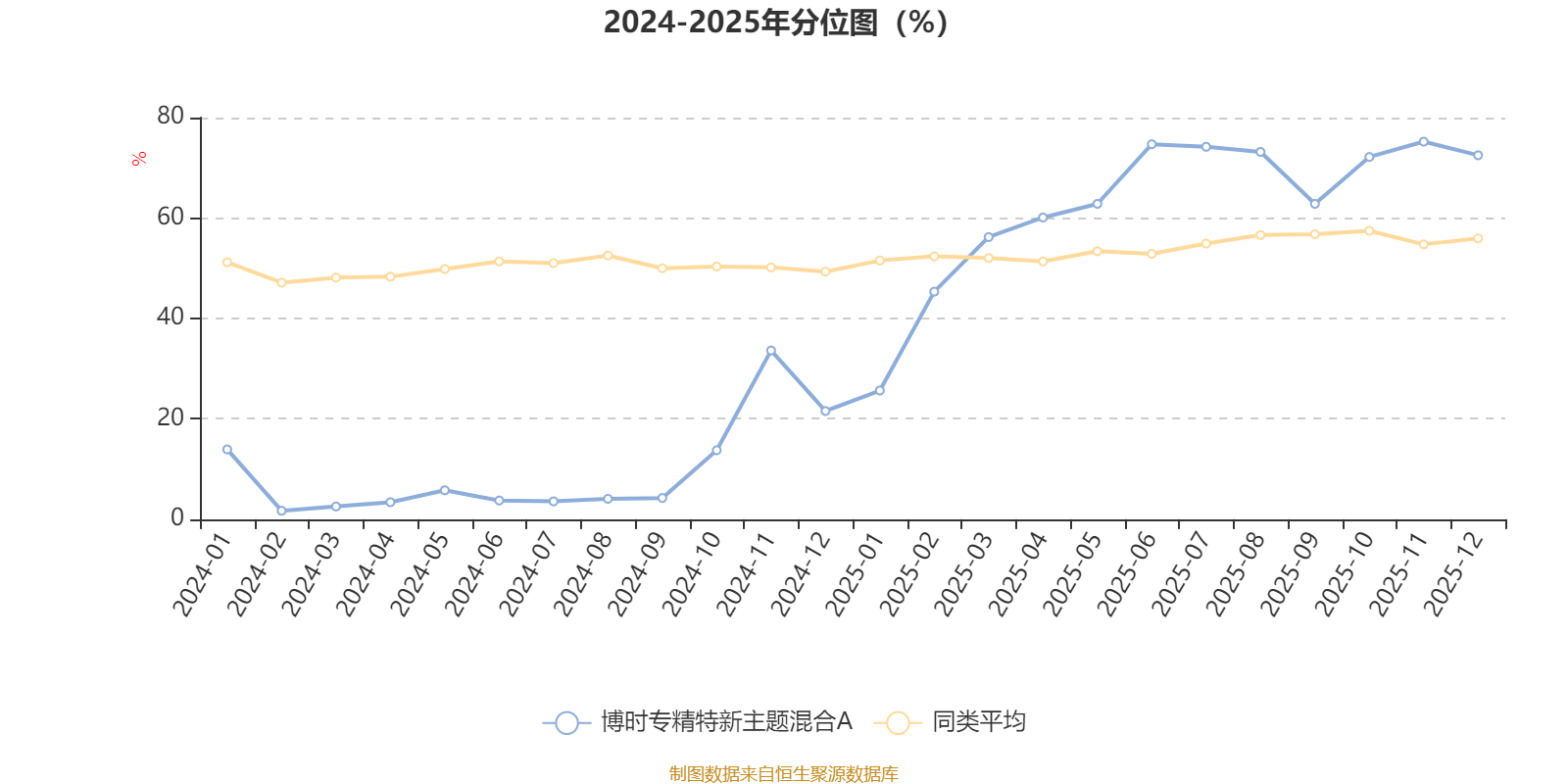 通过所选区间该基金净值增长率分位图,可以观察该基金与同类基金业绩比较情况。图为坐标原点到区间内某时点的净值增长率在同类基金中的分位数。