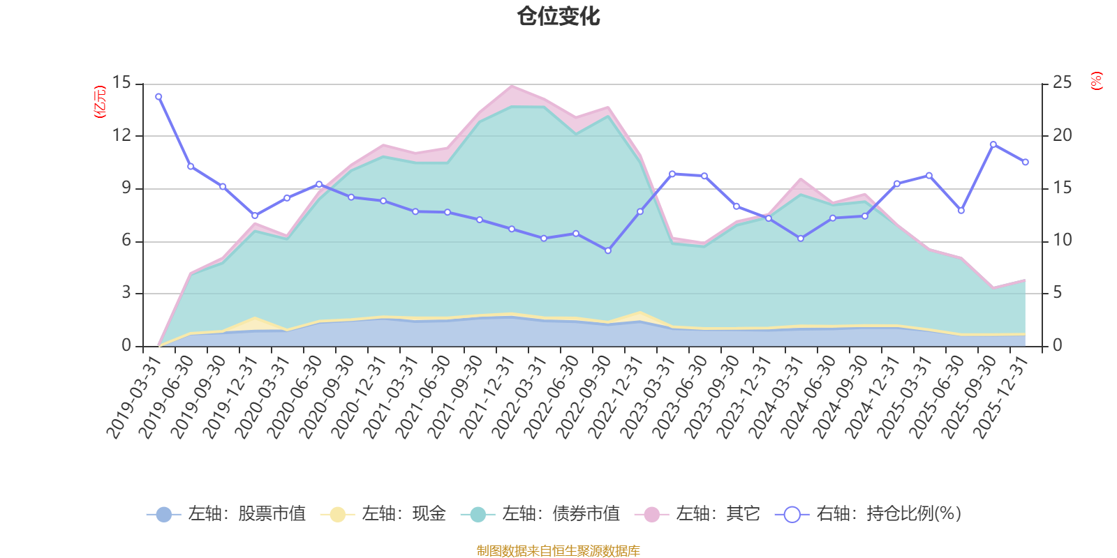 据定期报告数据统计,近三年平均股票仓位为14.54%,同类平均为72.57%。2019年一季度末基金达到23.77%的最高仓位,2022年三季度末最低,为9.11%。