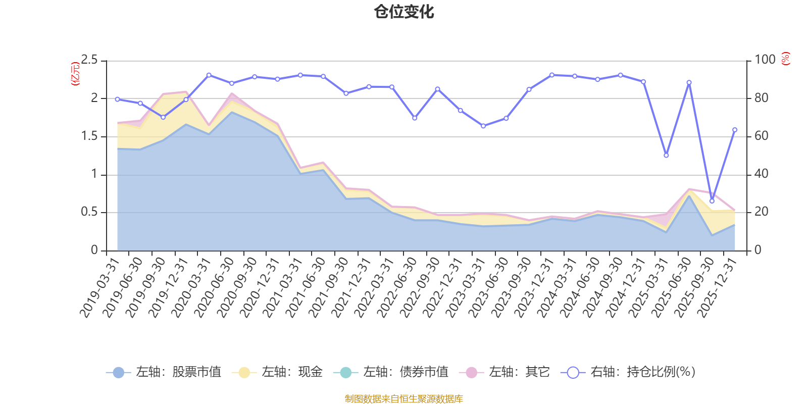 据定期报告数据统计,近三年平均股票仓位为75.36%,同类平均为72.57%。2023年末基金达到92.44%的最高仓位,2025年三季度末最低,为26.16%。