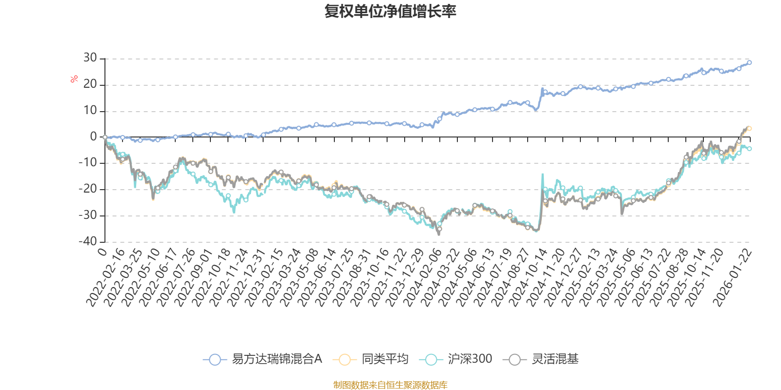 截至1月22日,易方达瑞锦混合A近三个月复权单位净值增长率为3.00%,位于同类可比基金973/1286;近半年复权单位净值增长率为5.27%,位于同类可比基金1060/1286;近一年复权单位净值增长率为8.63%,位于同类可比基金1115/1286;近三年复权单位净值增长率为25.63%,位于同类可比基金449/1286。