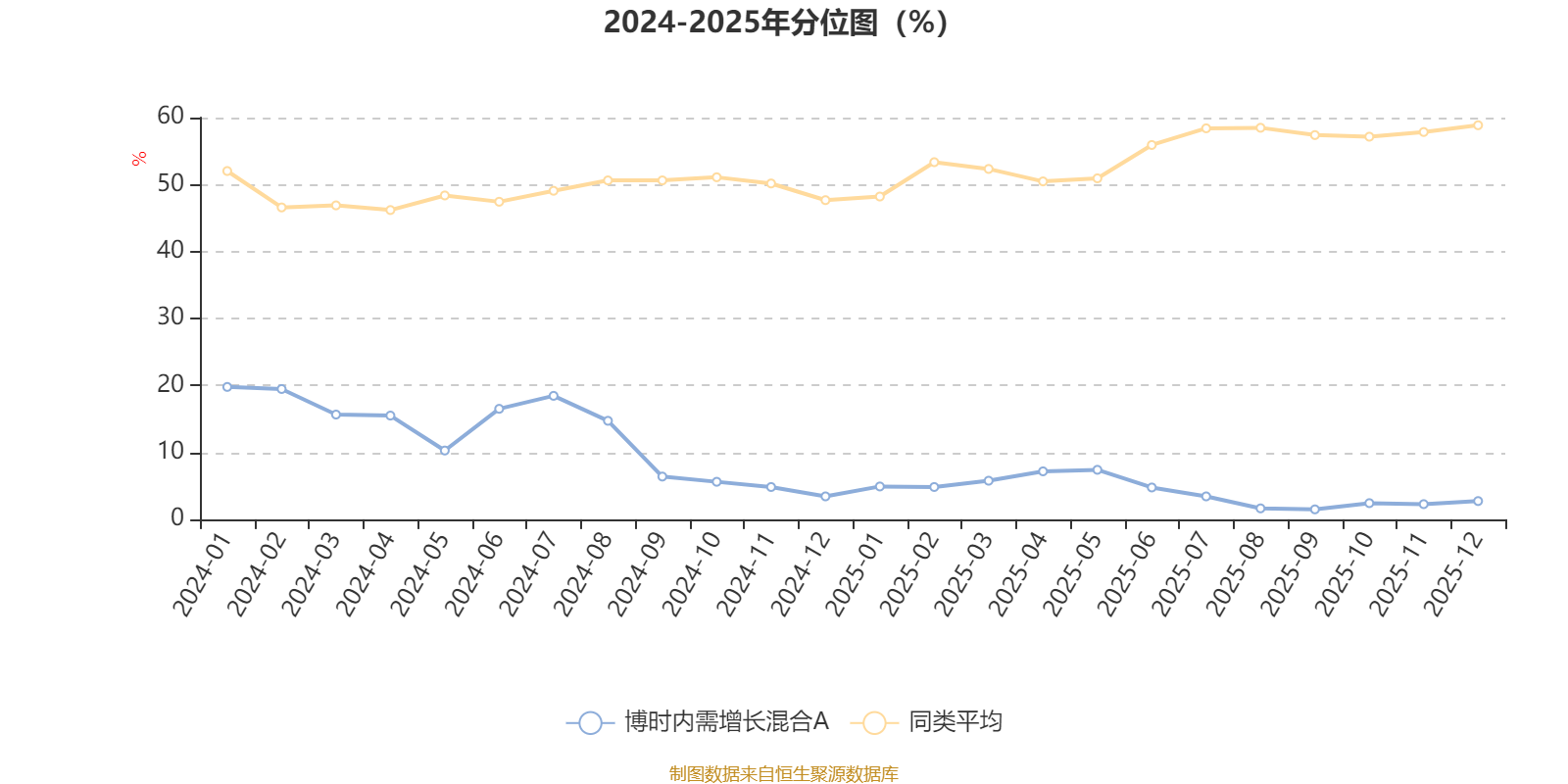 通过所选区间该基金净值增长率分位图,可以观察该基金与同类基金业绩比较情况。图为坐标原点到区间内某时点的净值增长率在同类基金中的分位数。