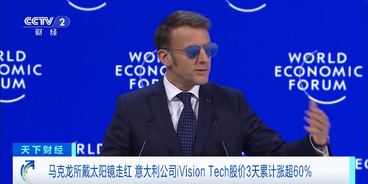 日前,法国总统马克龙在瑞士达沃斯世界经济论坛年会时因眼部不适、佩戴太阳镜出席众多场合,引发网络热议。马克龙的这款太阳镜意外走红,受此影响,该眼镜品牌的意大利母公司iVision Tech的股价在3天内涨超60%。