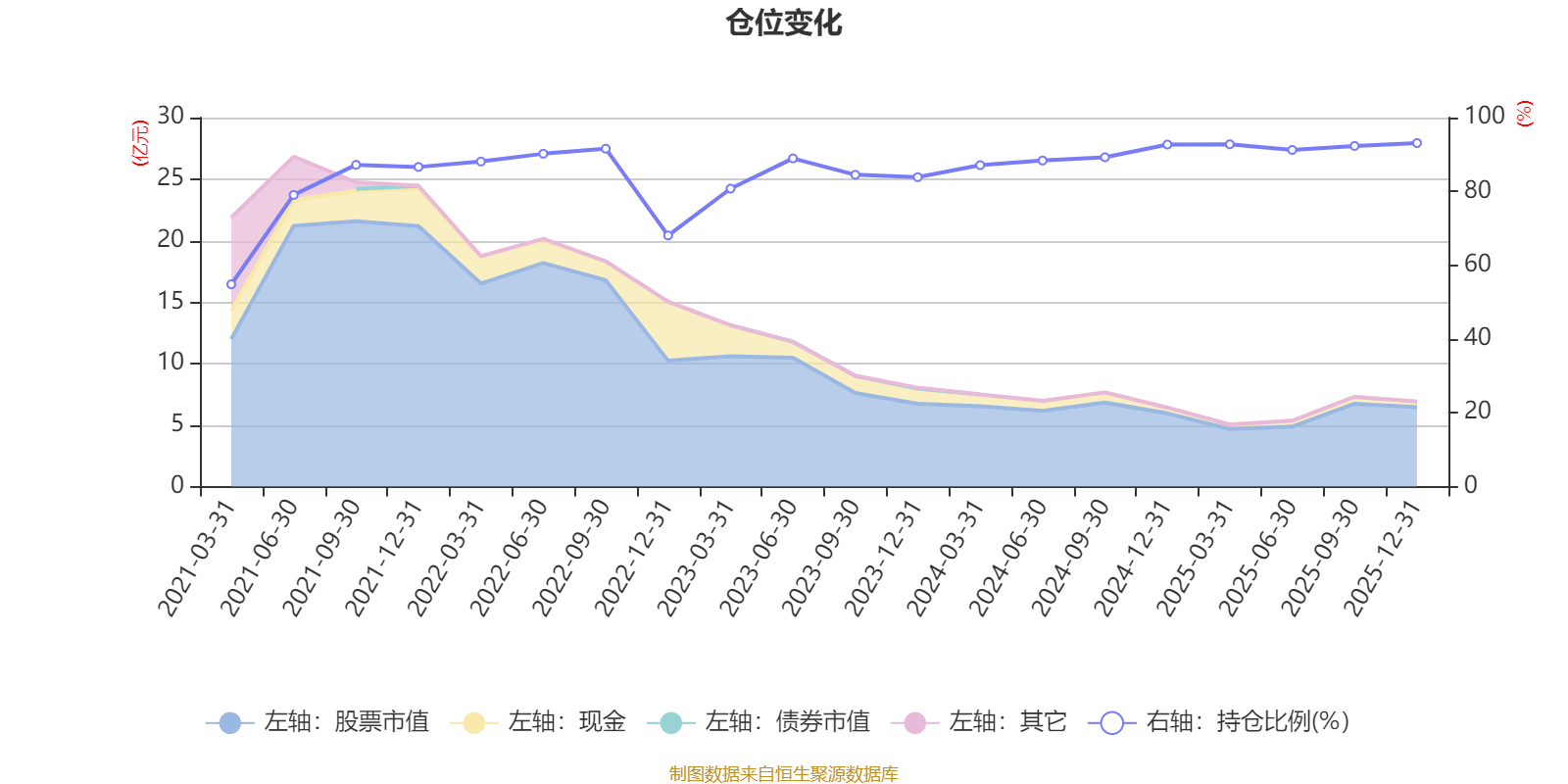 据定期报告数据统计,近三年平均股票仓位为88.74%,同类平均为85.83%。2025年末基金达到93.11%的最高仓位,2021年一季度末最低,为54.83%。