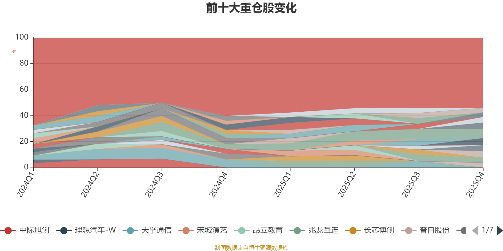 截至2025年四季度末,基金十大重仓股分别是新易盛、长川科技、振华股份、德明利、佰维存储、聚辰股份、芯碁微装、普冉股份、杰华特、财富趋势。
