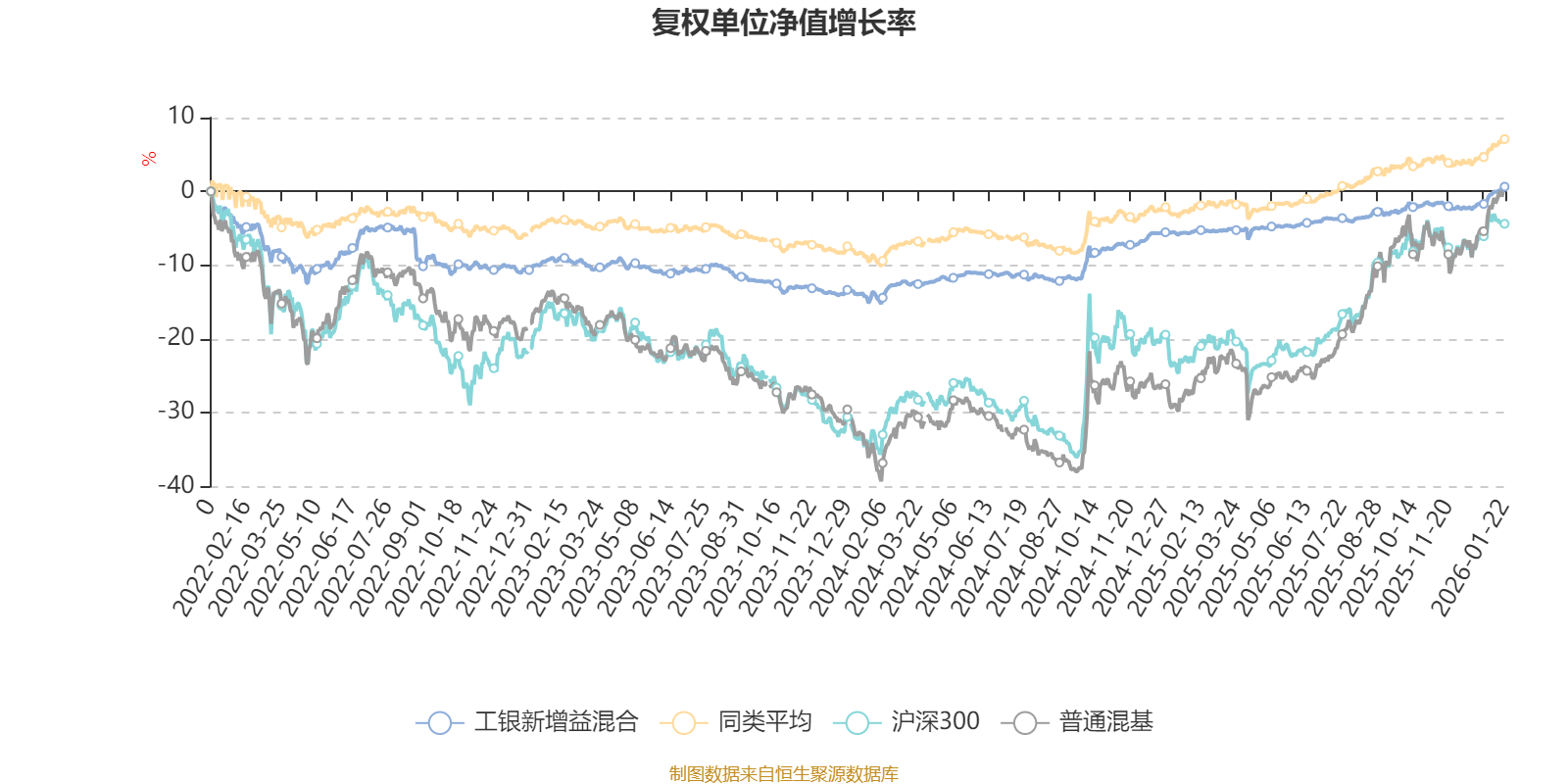 截至1月22日,工银新增益混合近三个月复权单位净值增长率为2.68%,位于同类可比基金237/629;近半年复权单位净值增长率为4.42%,位于同类可比基金298/629;近一年复权单位净值增长率为6.70%,位于同类可比基金371/626;近三年复权单位净值增长率为10.96%,位于同类可比基金312/564。