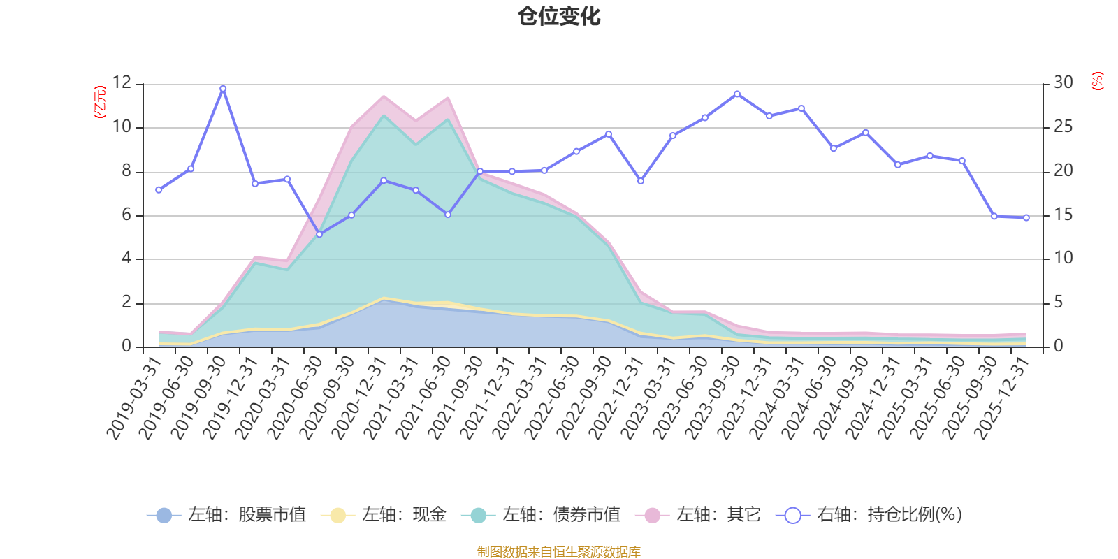 据定期报告数据统计,近三年平均股票仓位为22.77%,同类平均为19.2%。2019年三季度末基金达到29.46%的最高仓位,2020年上半年末最低,为12.84%。
