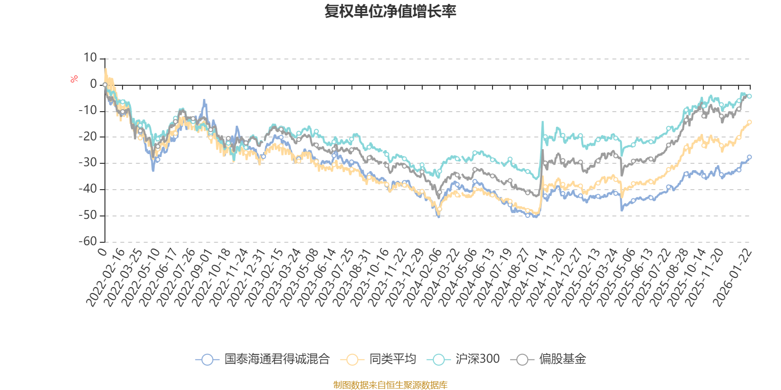 截至1月22日,国泰海通君得诚混合近三个月复权单位净值增长率为12.32%,位于同类可比基金194/621;近半年复权单位净值增长率为18.64%,位于同类可比基金425/621;近一年复权单位净值增长率为26.68%,位于同类可比基金470/613;近三年复权单位净值增长率为-7.47%,位于同类可比基金463/535。