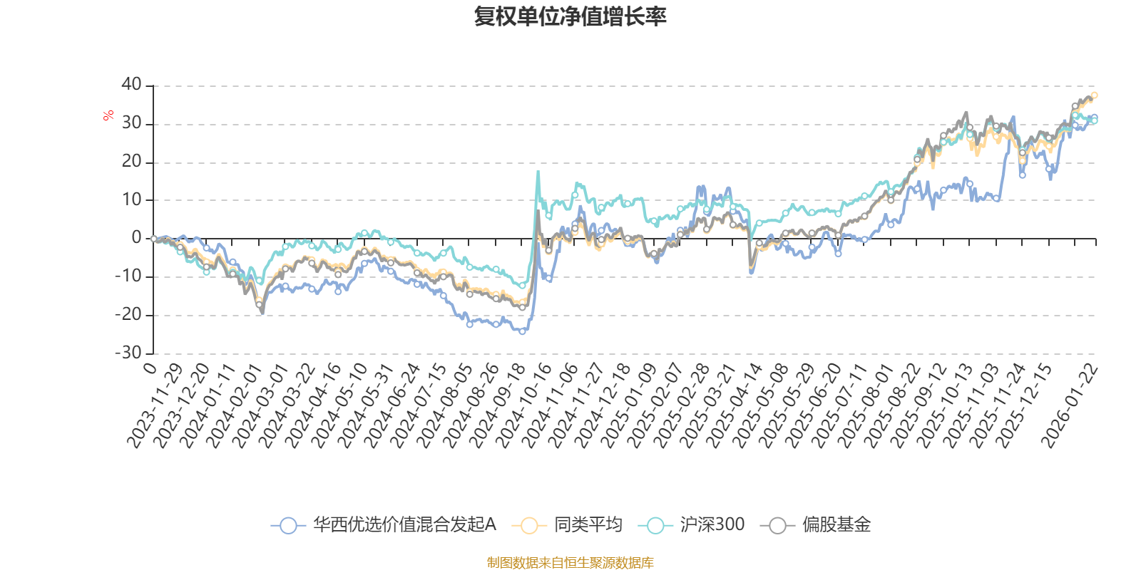截至1月22日,华西优选价值混合发起A近三个月复权单位净值增长率为19.35%,位于同类可比基金91/689;近半年复权单位净值增长率为29.08%,位于同类可比基金263/689;近一年复权单位净值增长率为31.48%,位于同类可比基金413/673。