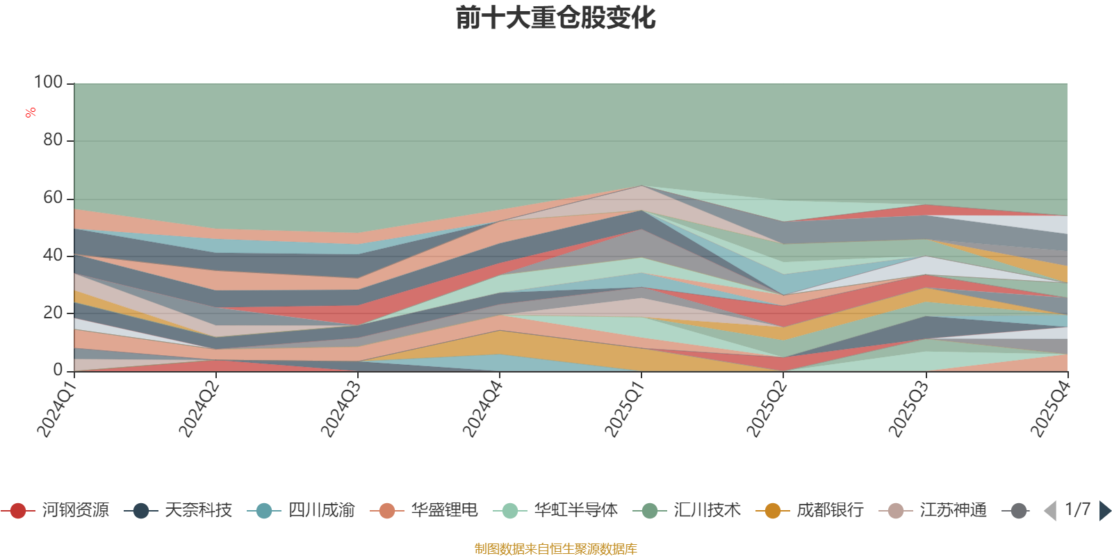 截至2025年四季度末,基金十大重仓股分别是海科新源、星源材质、中国国航、恩捷股份、华盛锂电、兆易创新、鲁西化工、京泉华、天赐材料、川环科技。