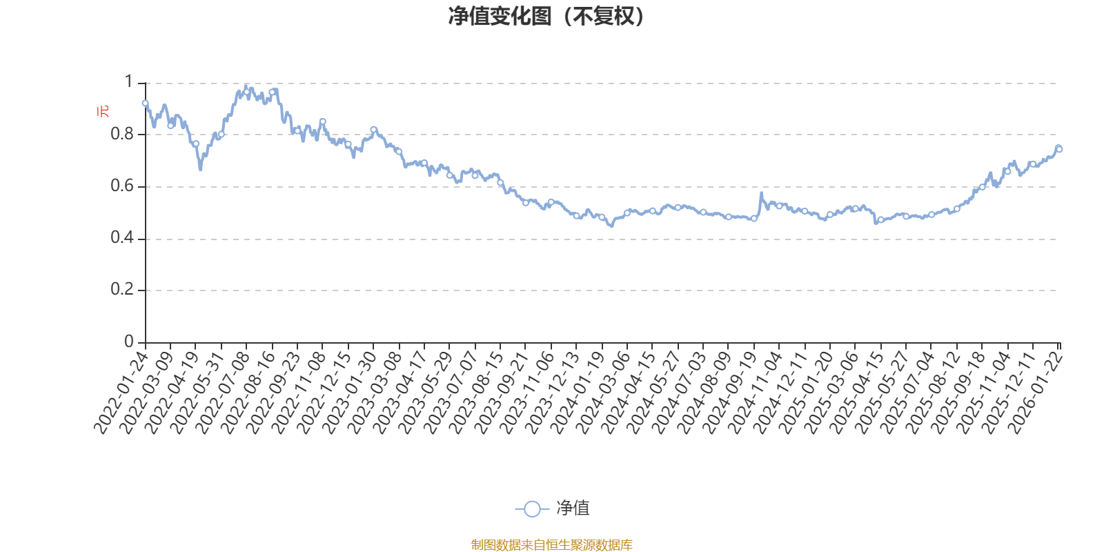 该基金属于偏股混合型基金。截至1月22日,单位净值为0.744元。基金经理是刘昇,目前管理的3只基金近一年均为正收益。其中,截至1月22日,汇添富新能源精选混合发起式A近一年复权单位净值增长率最高,达59.66%;汇添富碳中和主题混合A最低,为51.14%。