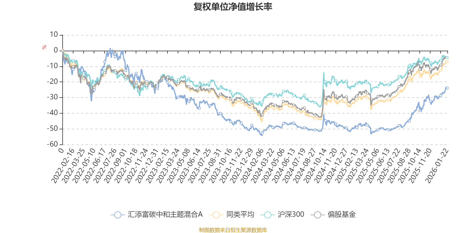 截至1月22日,汇添富碳中和主题混合A近三个月复权单位净值增长率为21.74%,位于同类可比基金6/185;近半年复权单位净值增长率为45.98%,位于同类可比基金24/185;近一年复权单位净值增长率为51.14%,位于同类可比基金57/183;近三年复权单位净值增长率为-7.10%,位于同类可比基金155/176。