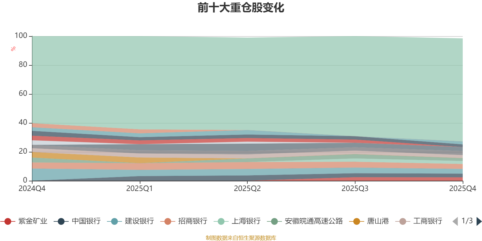 且持股标的较为稳定。截至2025年四季度末,基金重仓股分别是招商银行、建设银行、渝农商行、农业银行、中国银行、紫金矿业、工商银行、上海银行、格力电器、安徽皖通高速公路、重庆农村商业银行。