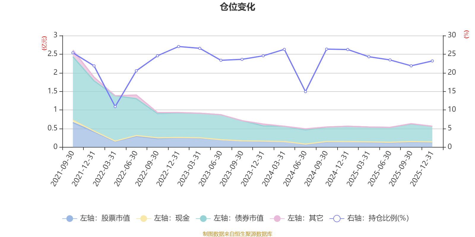 据定期报告数据统计,近三年平均股票仓位为23.72%,同类平均为19.2%。2022年末基金达到27.05%的最高仓位,2022年一季度末最低,为10.9%。