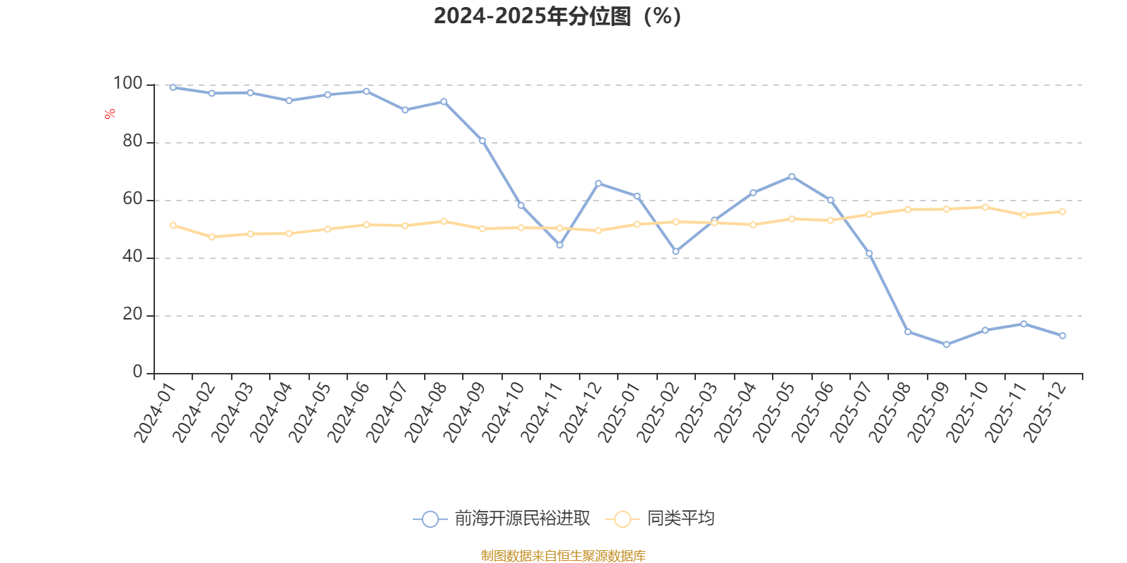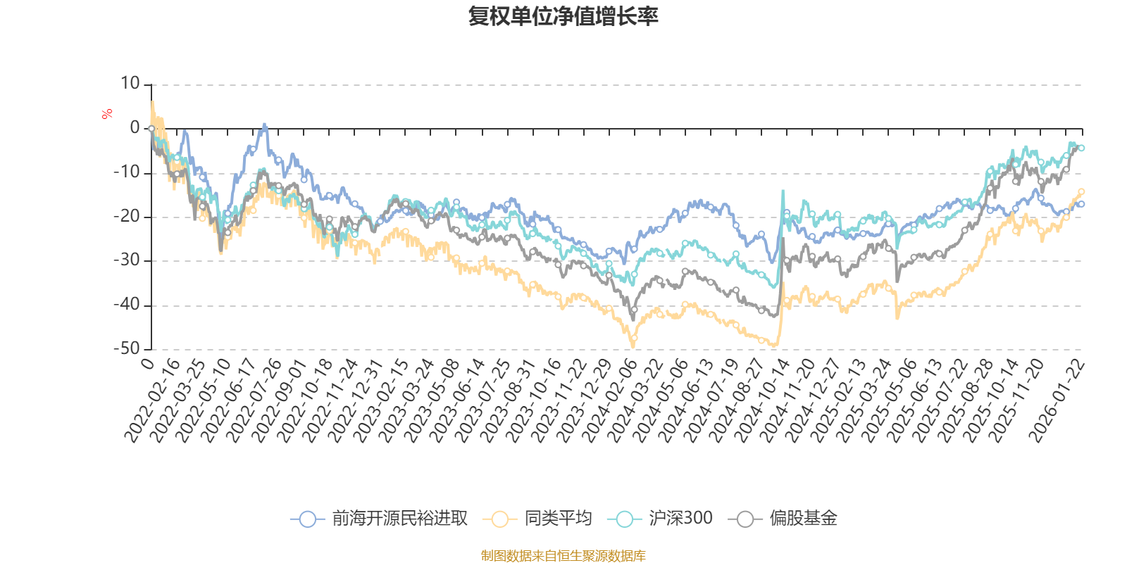 截至1月22日,前海开源民裕进取近三个月复权单位净值增长率为-0.91%,位于同类可比基金593/621;近半年复权单位净值增长率为-0.19%,位于同类可比基金602/621;近一年复权单位净值增长率为10.79%,位于同类可比基金594/613;近三年复权单位净值增长率为2.19%,位于同类可比基金394/535。