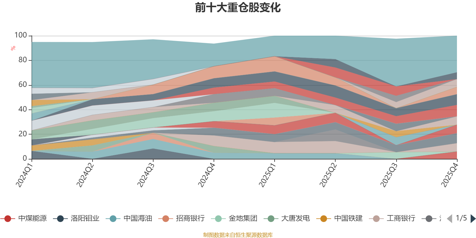 该基金持股集中度较高,近2年前十大重仓股集中度长期超过60%。截至2025年四季度末,基金十大重仓股分别是农业银行、中信银行、中国海洋石油、建设银行、工商银行、中国石油、兖矿能源、中煤能源、中国神华、杭州银行。