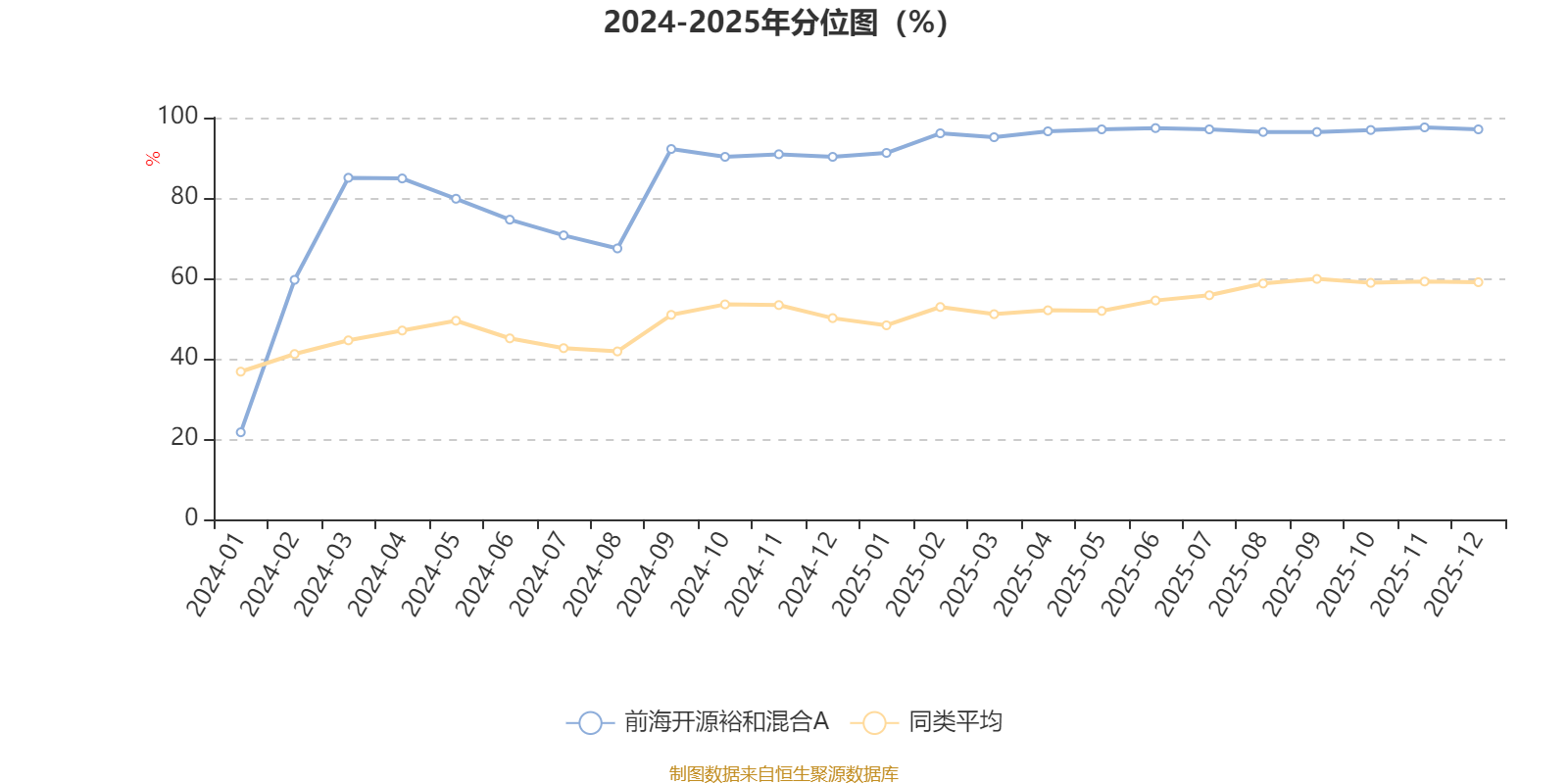 通过所选区间该基金净值增长率分位图,可以观察该基金与同类基金业绩比较情况。图为坐标原点到区间内某时点的净值增长率在同类基金中的分位数。