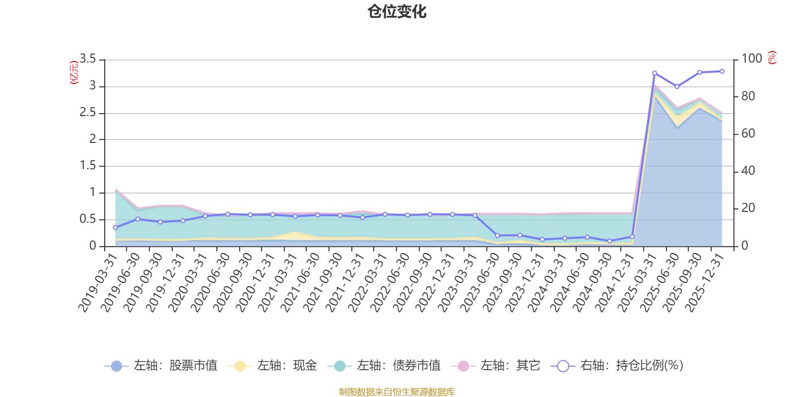 据定期报告数据统计,近三年平均股票仓位为34.56%,同类平均为72.57%。2025年末基金达到93.74%的最高仓位,2024年三季度末最低,为2.9%。