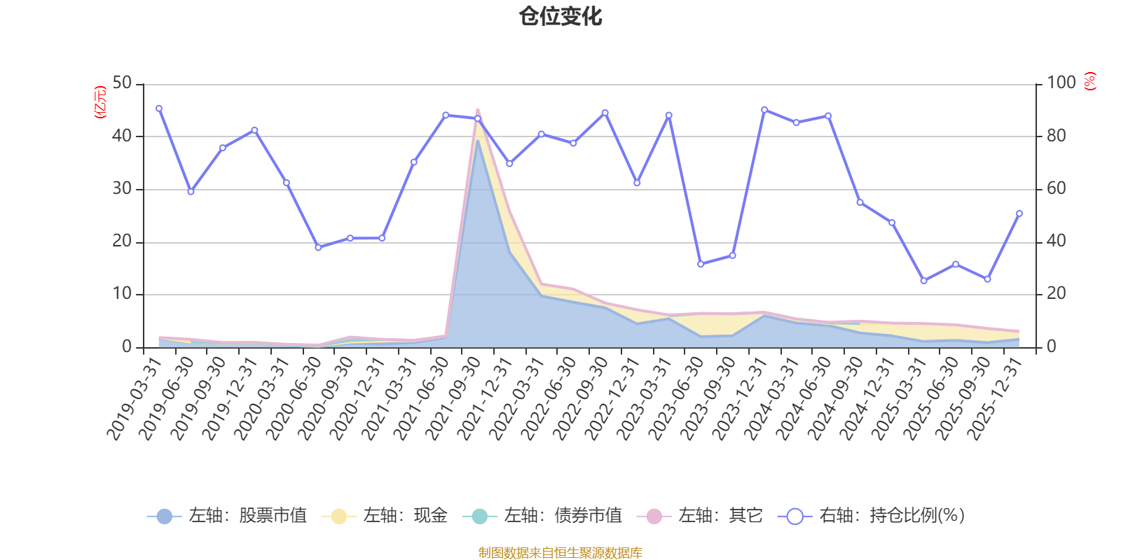 据定期报告数据统计,近三年平均股票仓位为54.55%,同类平均为72.57%。2019年一季度末基金达到90.75%的最高仓位,2025年一季度末最低,为25.37%。