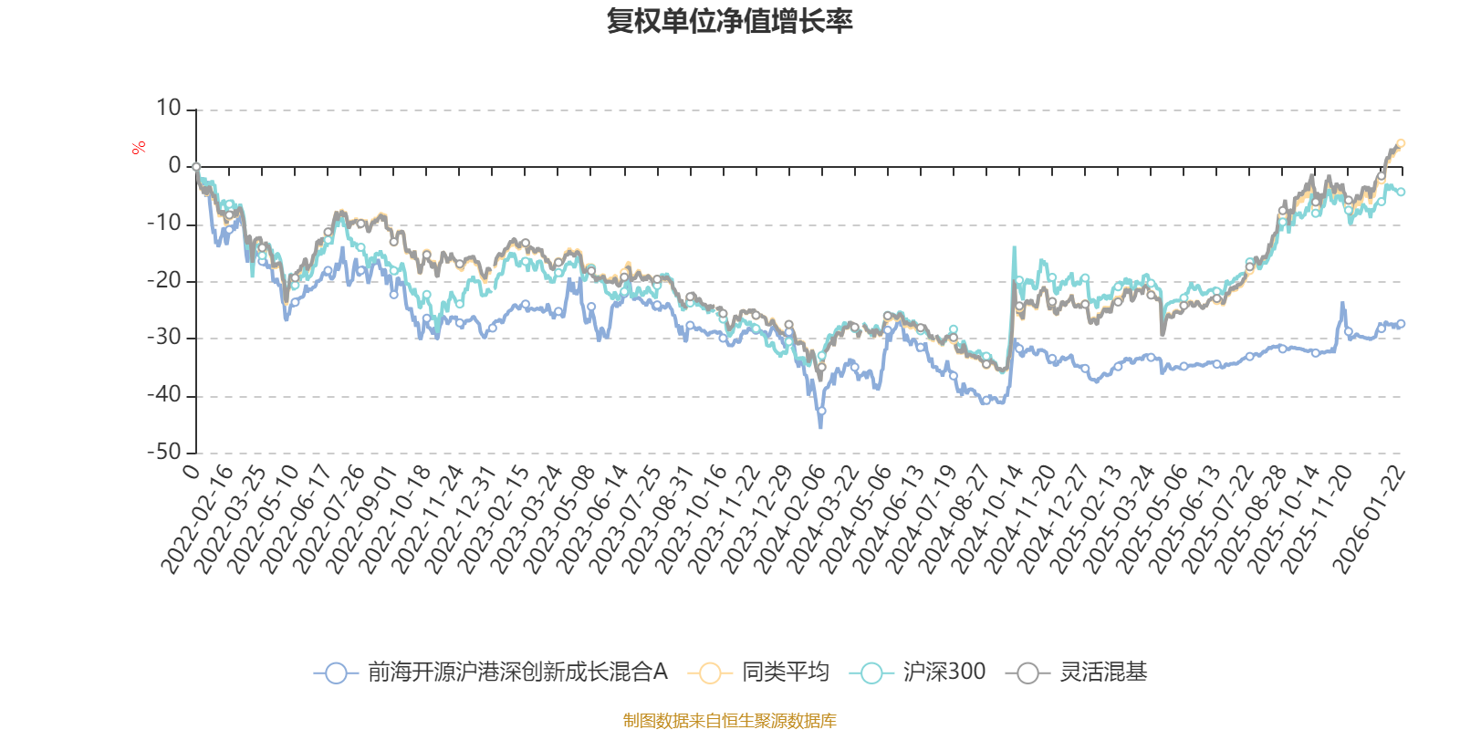 截至1月22日,前海开源沪港深创新成长混合A近三个月复权单位净值增长率为7.44%,位于同类可比基金719/1286;近半年复权单位净值增长率为8.58%,位于同类可比基金970/1286;近一年复权单位净值增长率为13.91%,位于同类可比基金1033/1286;近三年复权单位净值增长率为-3.04%,位于同类可比基金1057/1286。
