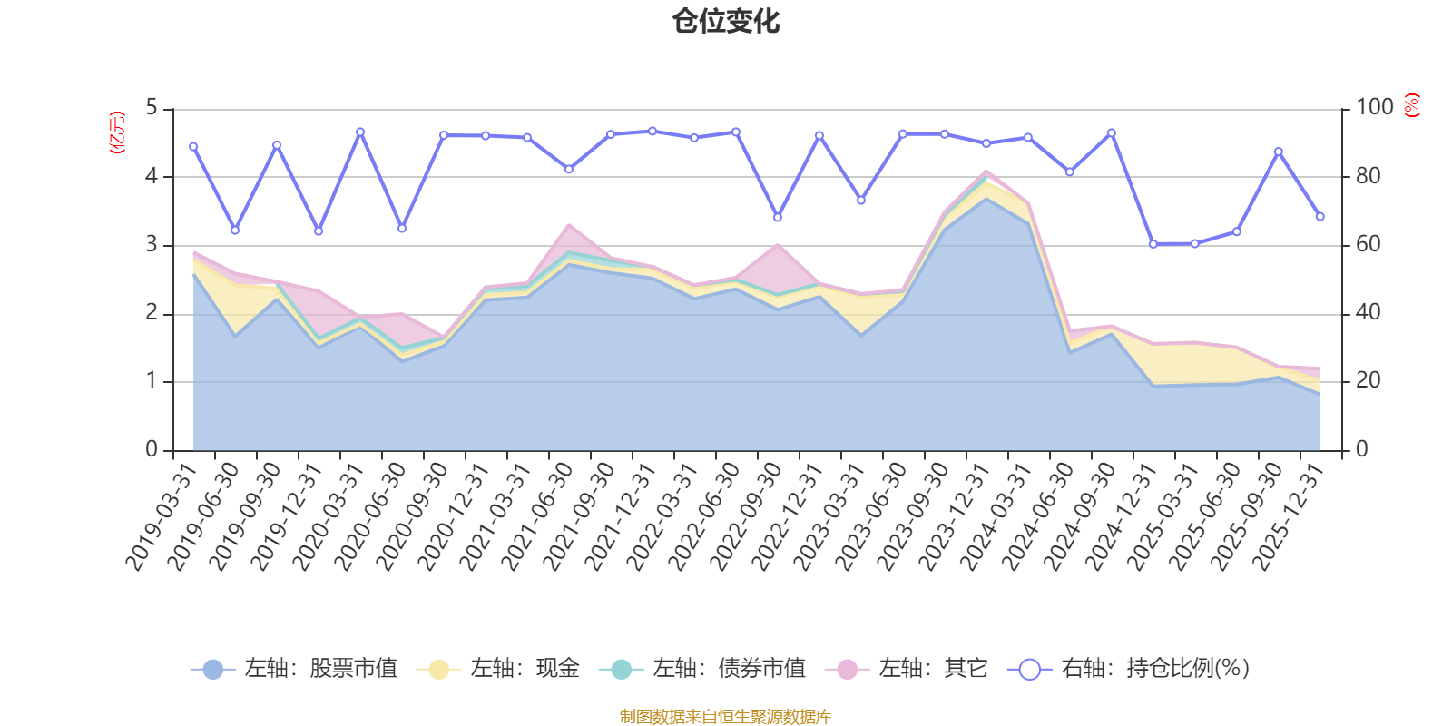 据定期报告数据统计,近三年平均股票仓位为79.65%,同类平均为85.83%。2021年末基金达到93.51%的最高仓位,2024年末最低,为60.44%。