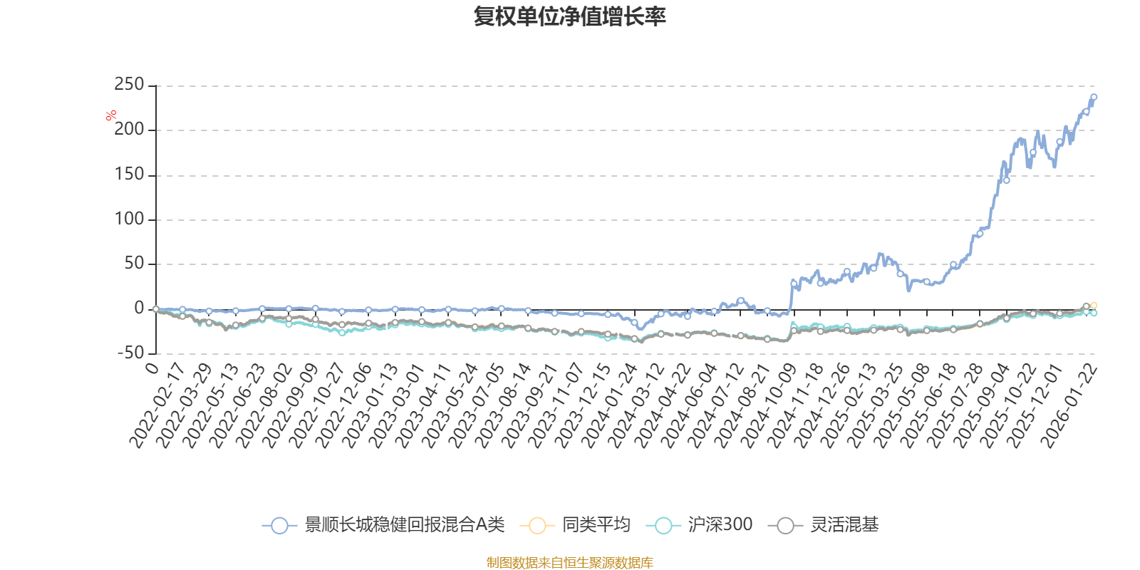 截至1月22日,景顺长城稳健回报混合A类近三个月复权单位净值增长率为22.44%,位于同类可比基金100/1286;近半年复权单位净值增长率为86.06%,位于同类可比基金9/1286;近一年复权单位净值增长率为122.45%,位于同类可比基金4/1286;近三年复权单位净值增长率为236.69%,位于同类可比基金2/1286。