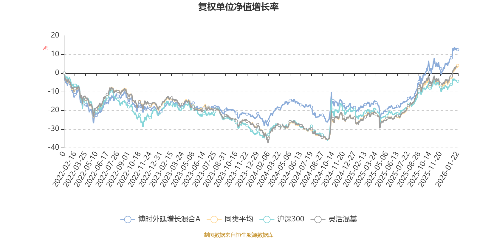 截至1月22日,博时外延增长混合A近三个月复权单位净值增长率为10.10%,位于同类可比基金566/1286;近半年复权单位净值增长率为30.11%,位于同类可比基金442/1286;近一年复权单位净值增长率为37.46%,位于同类可比基金552/1286;近三年复权单位净值增长率为34.97%,位于同类可比基金322/1286。