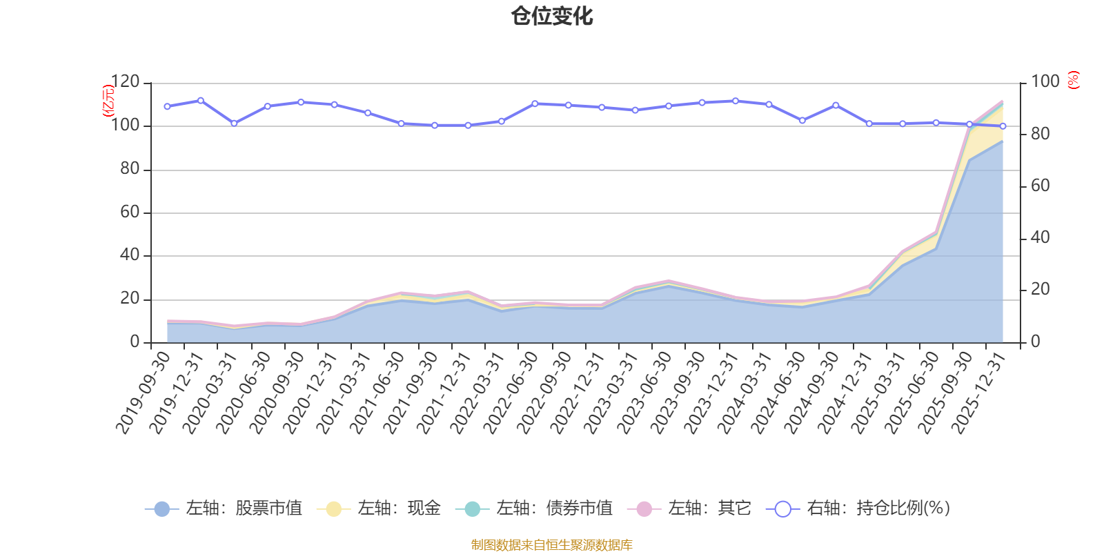 据定期报告数据统计,近三年平均股票仓位为87.92%,同类平均为72.57%。2019年末基金达到93.18%的最高仓位,2025年末最低,为83.32%。