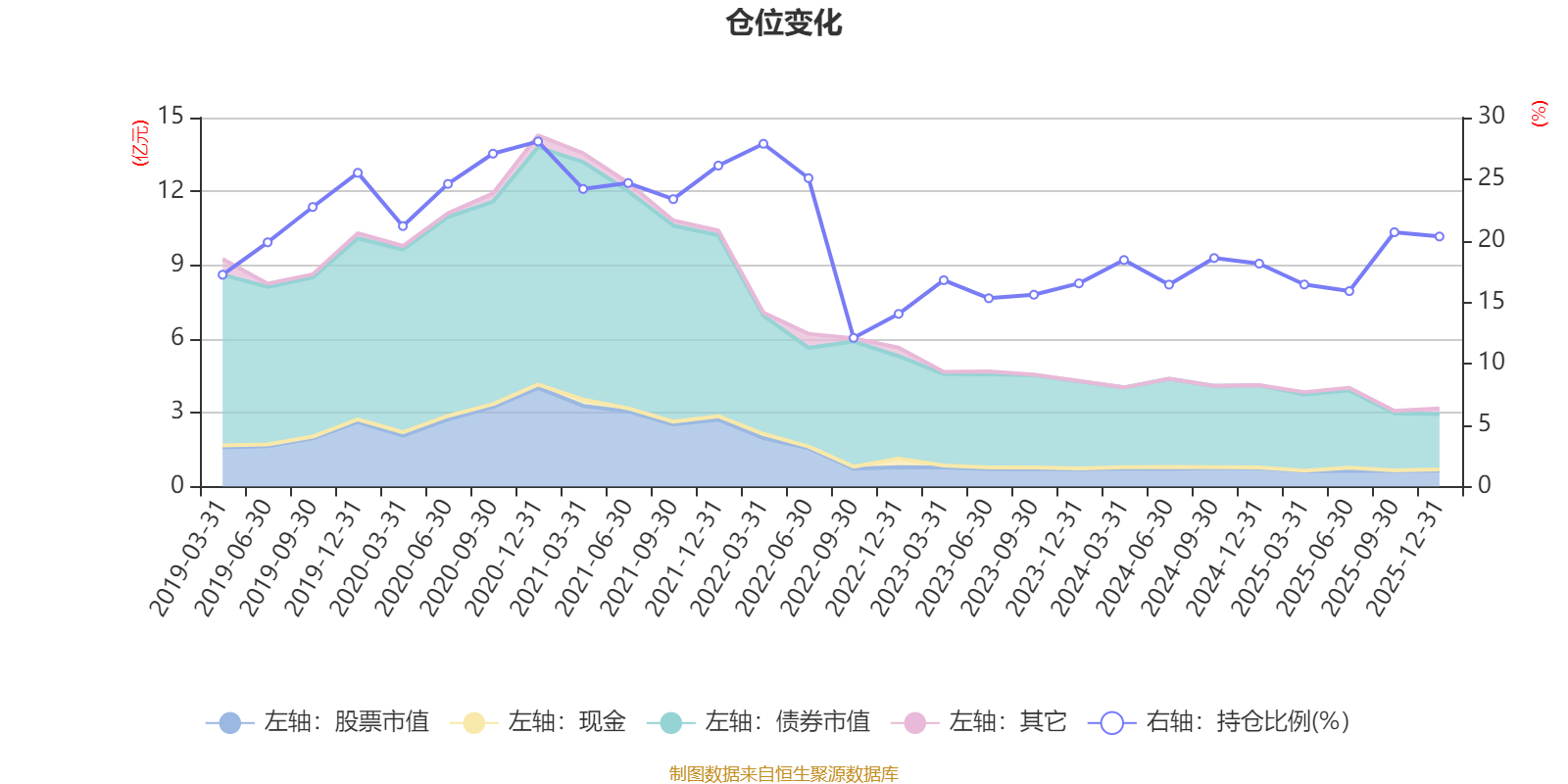 据定期报告数据统计,近三年平均股票仓位为17.42%,同类平均为72.57%。2020年末基金达到28.06%的最高仓位,2022年三季度末最低,为12.09%。