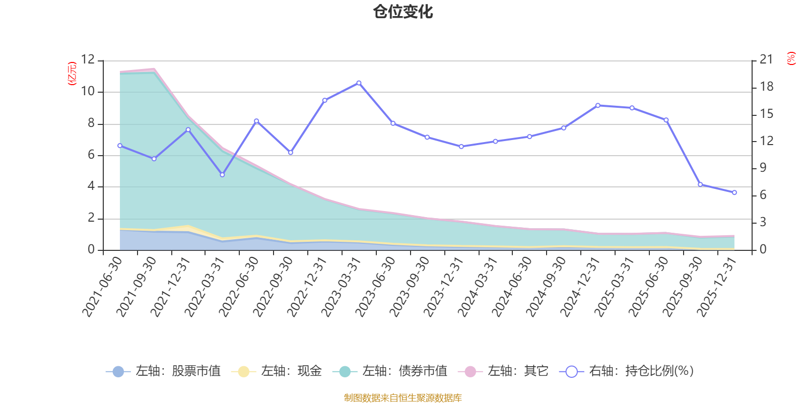 据定期报告数据统计,近三年平均股票仓位为12.87%,同类平均为19.2%。2023年一季度末基金达到18.51%的最高仓位,2025年末最低,为6.38%。