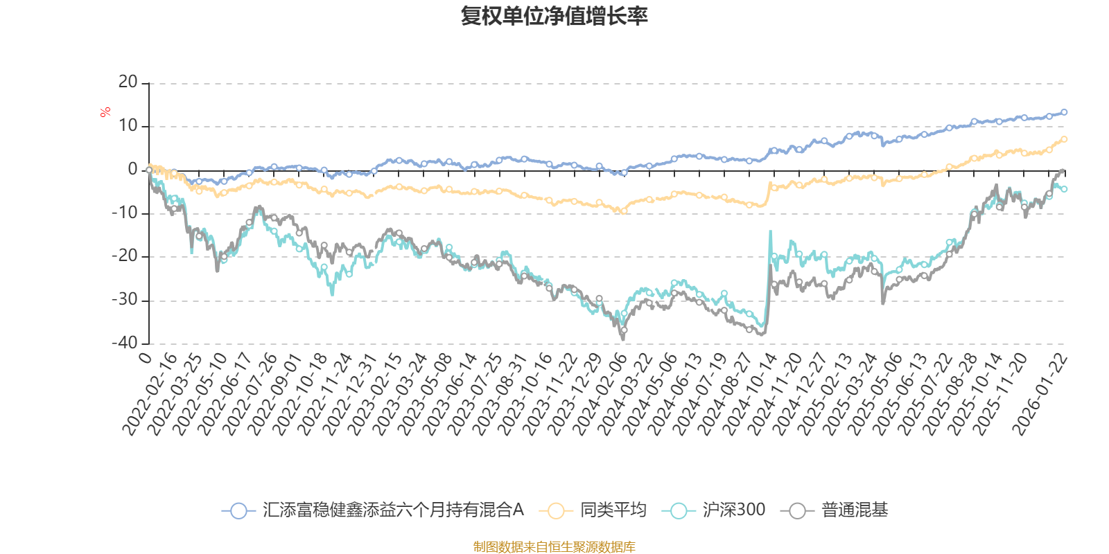 截至1月22日,汇添富稳健鑫添益六个月持有混合A近三个月复权单位净值增长率为1.83%,位于同类可比基金368/629;近半年复权单位净值增长率为3.31%,位于同类可比基金403/629;近一年复权单位净值增长率为6.60%,位于同类可比基金381/626;近三年复权单位净值增长率为10.99%,位于同类可比基金309/564。