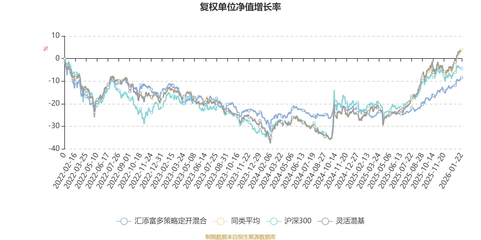截至1月22日,汇添富多策略定开混合近三个月复权单位净值增长率为9.58%,位于同类可比基金599/1286;近半年复权单位净值增长率为16.98%,位于同类可比基金758/1286;近一年复权单位净值增长率为20.54%,位于同类可比基金910/1286;近三年复权单位净值增长率为4.14%,位于同类可比基金943/1286。