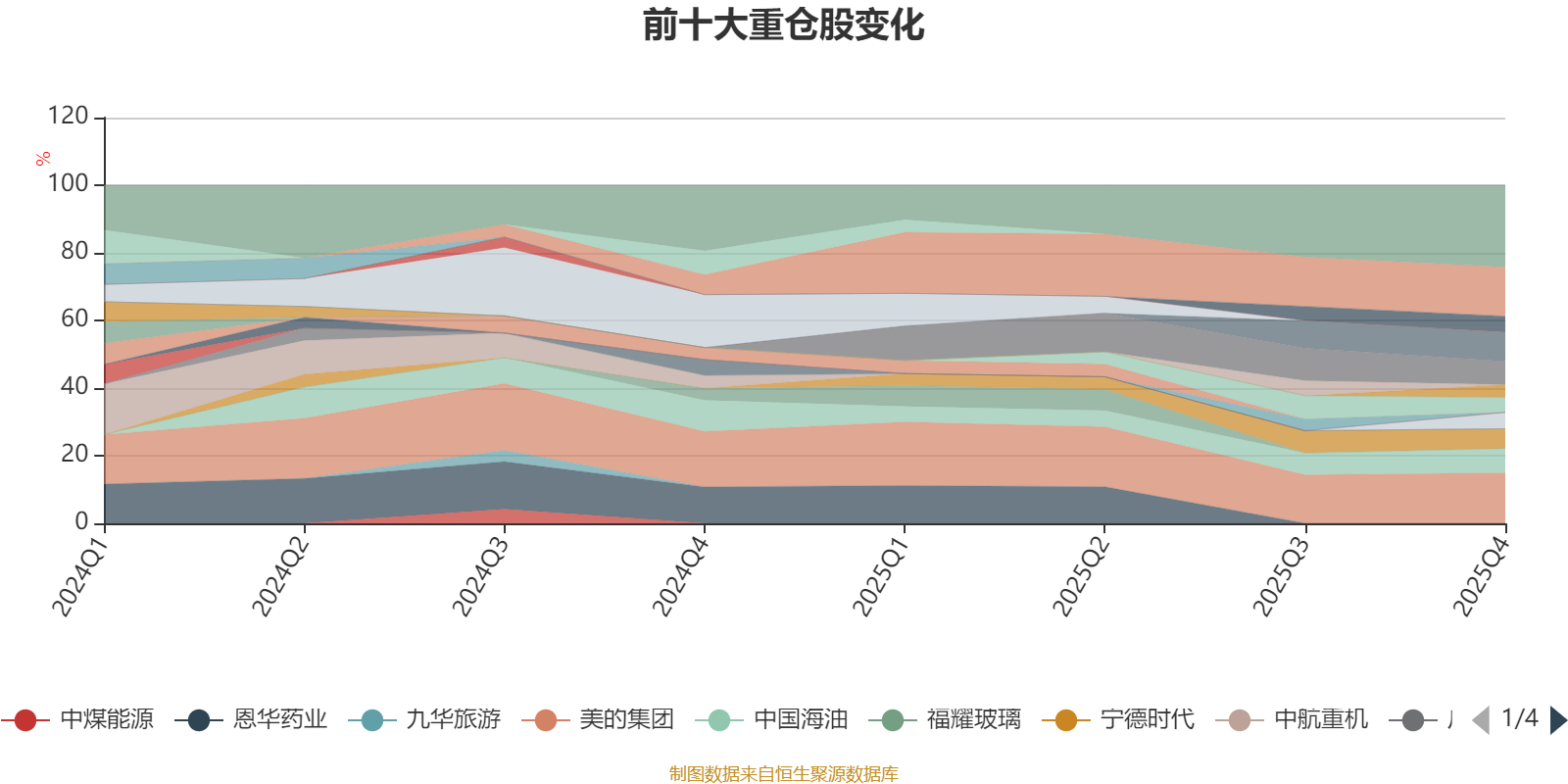 该基金持股集中度较高,近2年前十大重仓股集中度长期超过60%。截至2025年四季度末,基金十大重仓股分别是美的集团、海尔智家、亚钾国际、中国海油、紫金矿业、宁德时代、金诚信、山推股份、东方铁塔、恒瑞医药。