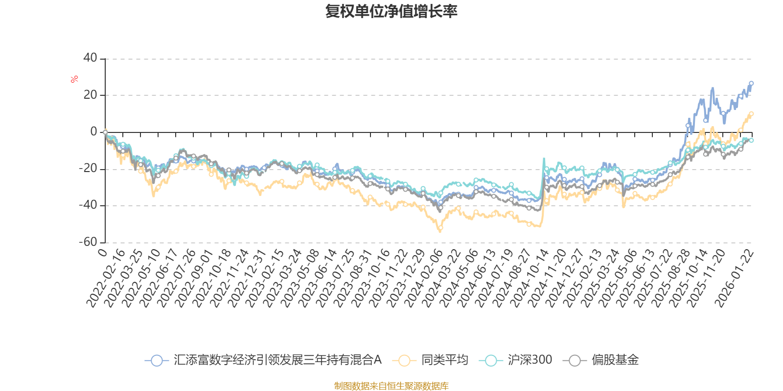 截至1月22日,汇添富数字经济引领发展三年持有混合A近三个月复权单位净值增长率为12.82%,位于同类可比基金138/229;近半年复权单位净值增长率为53.64%,位于同类可比基金118/229;近一年复权单位净值增长率为71.47%,位于同类可比基金71/222;近三年复权单位净值增长率为50.54%,位于同类可比基金92/165。