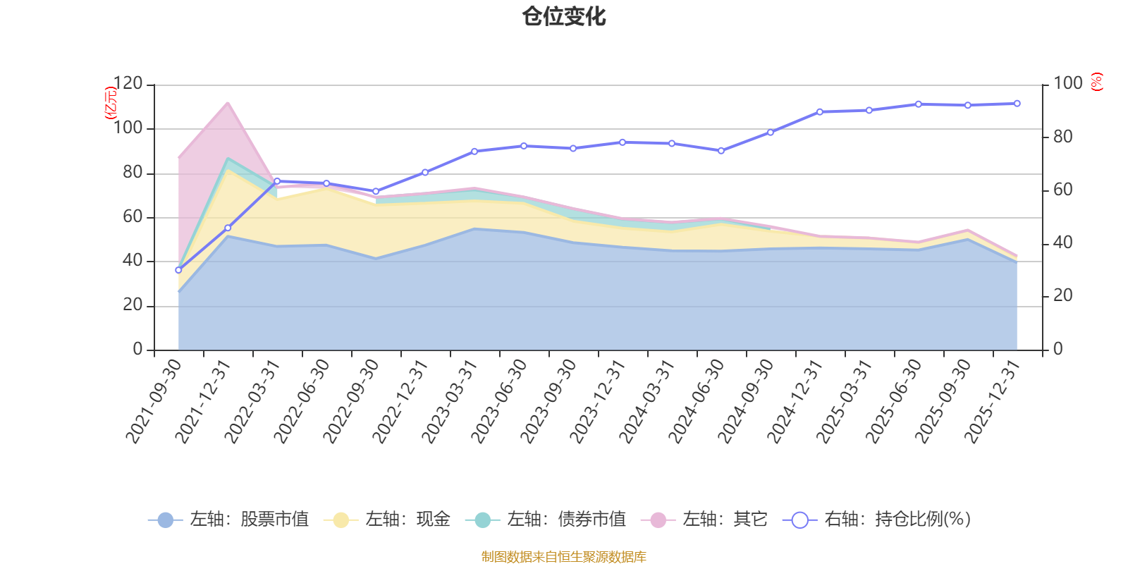 据定期报告数据统计,近三年平均股票仓位为83.23%,同类平均为86.9%。2025年末基金达到92.91%的最高仓位,2021年三季度末最低,为30.13%。