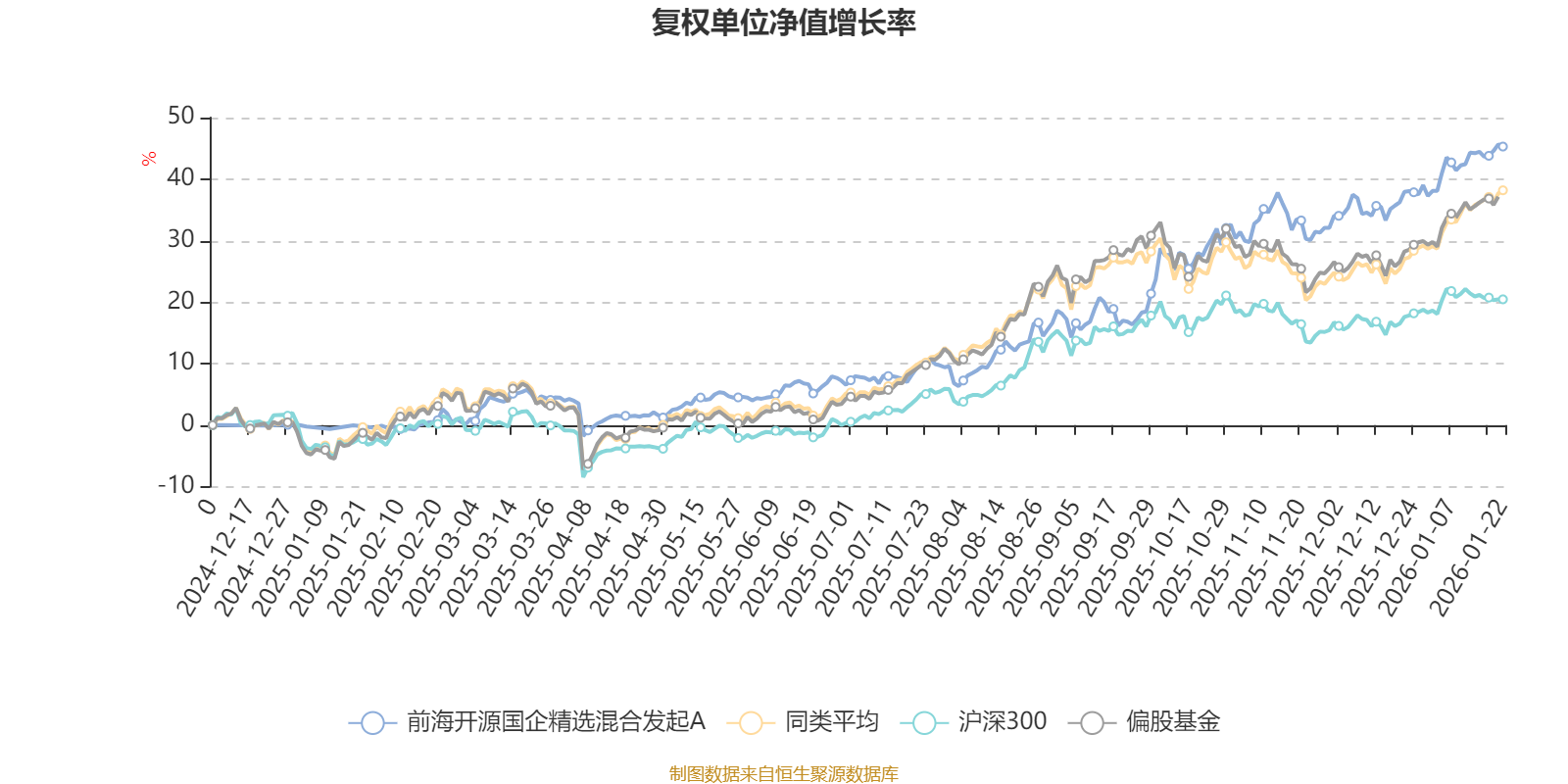 截至1月22日,前海开源国企精选混合发起A近三个月复权单位净值增长率为13.91%,位于同类可比基金193/689;近半年复权单位净值增长率为32.19%,位于同类可比基金220/689;近一年复权单位净值增长率为45.36%,位于同类可比基金250/673。