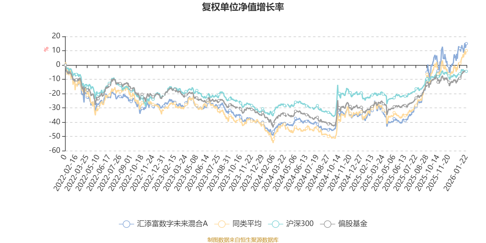 截至1月22日,汇添富数字未来混合A近三个月复权单位净值增长率为13.27%,位于同类可比基金134/229;近半年复权单位净值增长率为62.28%,位于同类可比基金79/229;近一年复权单位净值增长率为72.25%,位于同类可比基金69/222;近三年复权单位净值增长率为51.40%,位于同类可比基金91/165。