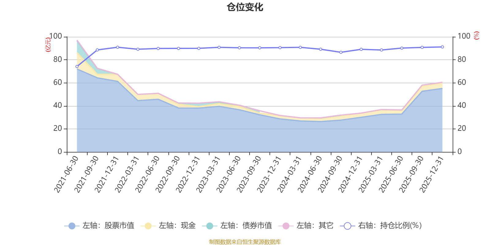 据定期报告数据统计,近三年平均股票仓位为89.87%,同类平均为86.9%。2025年末基金达到91.18%的最高仓位,2021年上半年末最低,为74.2%。