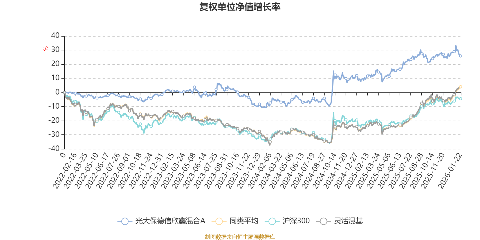 截至1月22日,光大保德信欣鑫混合A近三个月复权单位净值增长率为0.68%,位于同类可比基金1143/1286;近半年复权单位净值增长率为2.03%,位于同类可比基金1168/1286;近一年复权单位净值增长率为16.34%,位于同类可比基金998/1286;近三年复权单位净值增长率为23.45%,位于同类可比基金487/1286。