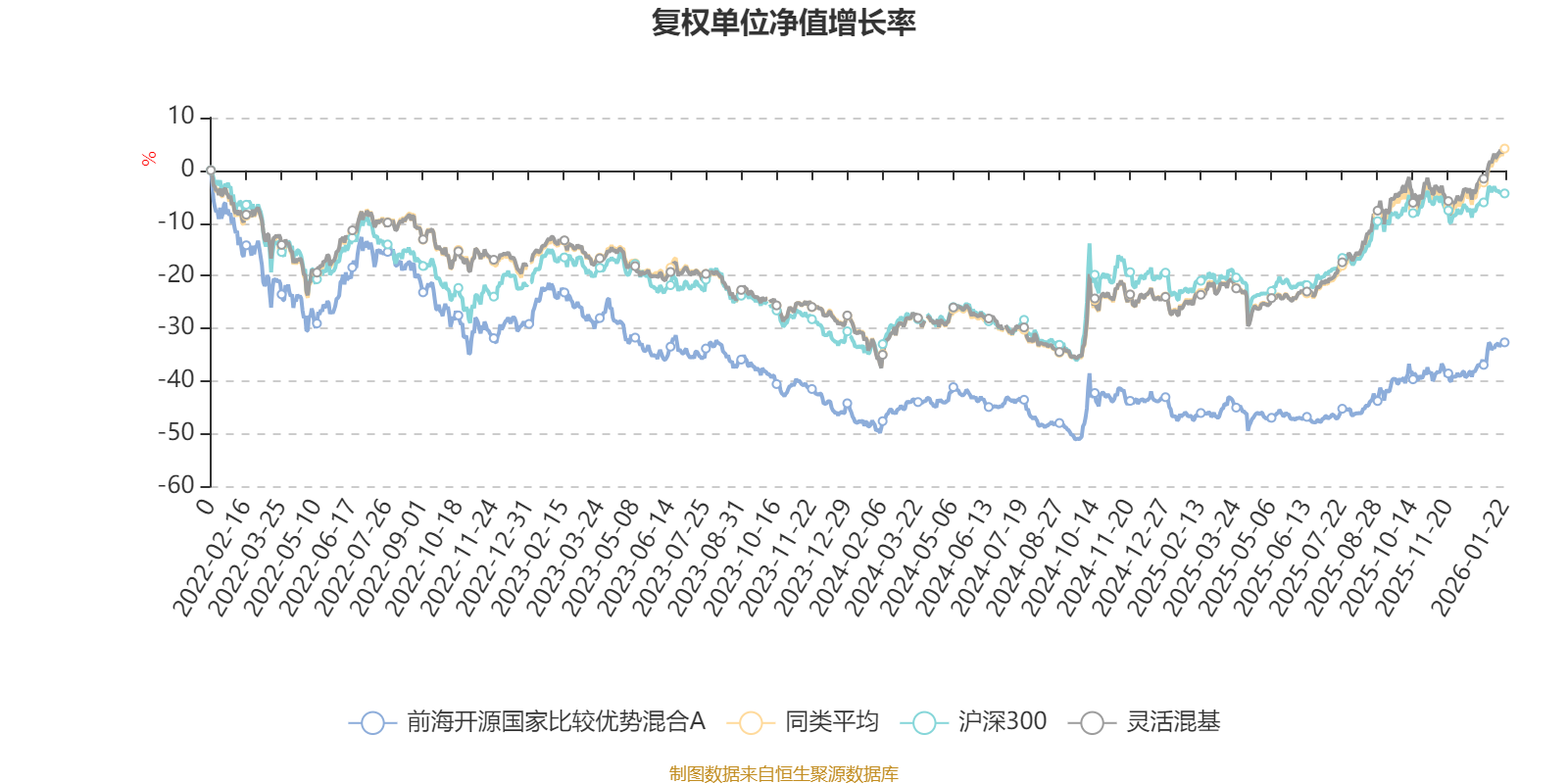 截至1月22日,前海开源国家比较优势混合A近三个月复权单位净值增长率为10.97%,位于同类可比基金510/1286;近半年复权单位净值增长率为22.97%,位于同类可比基金599/1286;近一年复权单位净值增长率为26.14%,位于同类可比基金787/1286;近三年复权单位净值增长率为-13.07%,位于同类可比基金1171/1286。
