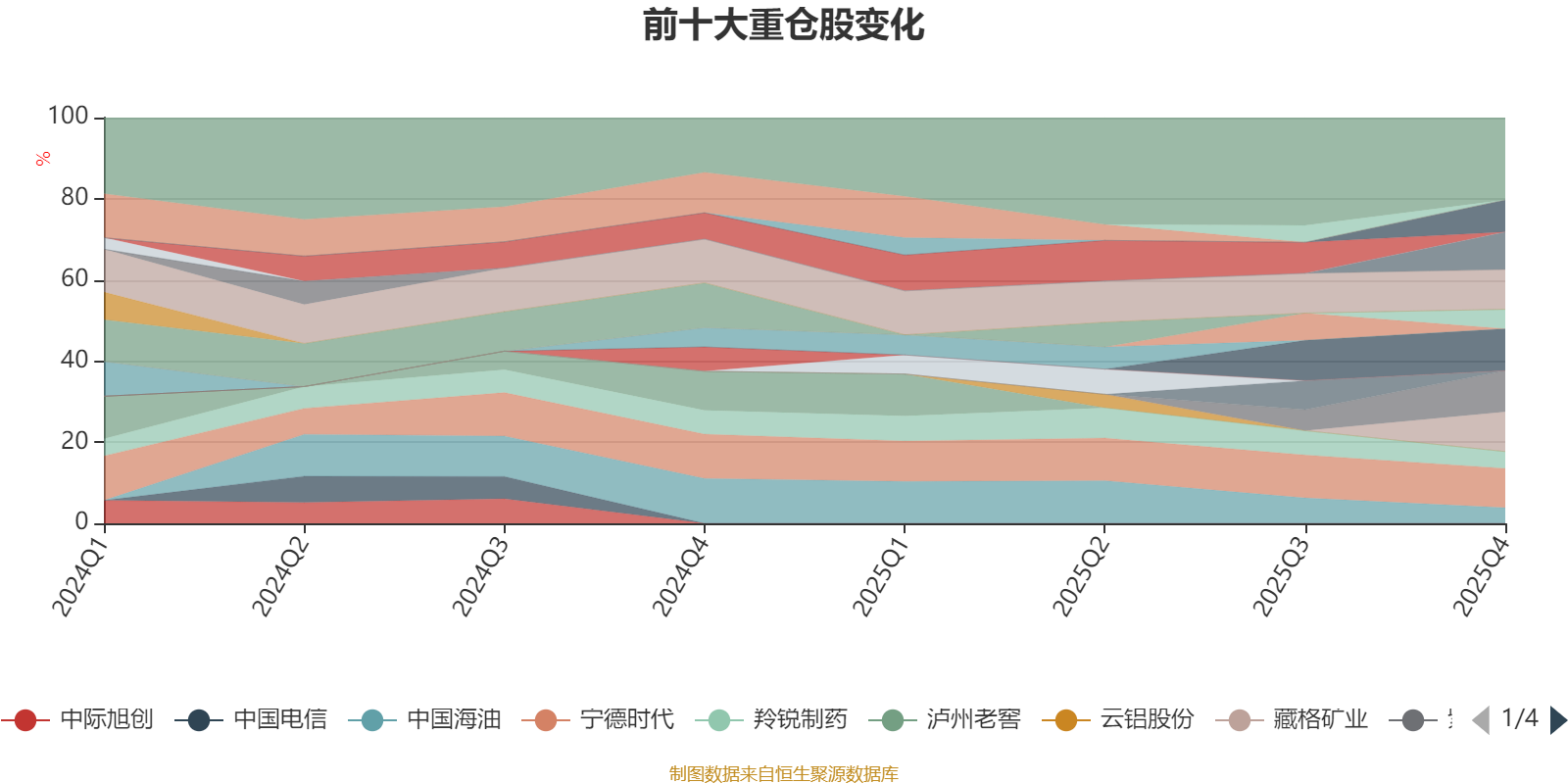该基金持股集中度较高,近2年前十大重仓股集中度长期超过60%。截至2025年四季度末,基金十大重仓股分别是中金黄金、紫金矿业、贵州茅台、藏格矿业、宁德时代、中国平安、中国太保、山东黄金、羚锐制药、中国海油。