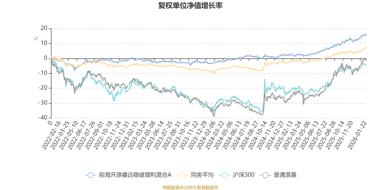 截至1月22日,前海开源睿远稳健增利混合A近三个月复权单位净值增长率为4.52%,位于同类可比基金94/629;近半年复权单位净值增长率为9.05%,位于同类可比基金90/629;近一年复权单位净值增长率为13.94%,位于同类可比基金98/626;近三年复权单位净值增长率为15.78%,位于同类可比基金161/564。